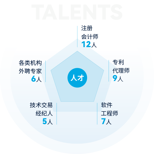 截止2024年,公司擁有各類人才400余人,其中全職博士2人,全職碩士23人,本科188人,???00余人,注冊會計師12人,專利代理師9人,軟件工程師7人,技術(shù)交易經(jīng)紀(jì)人5人,南京企服中心等各類機(jī)構(gòu)外聘專家6人,公司還和南京大學(xué)、東南大學(xué)、南京農(nóng)業(yè)大學(xué)、南京信息工程大學(xué)、南通大學(xué)、江蘇開放大學(xué)等建立了良好的合作關(guān)系。